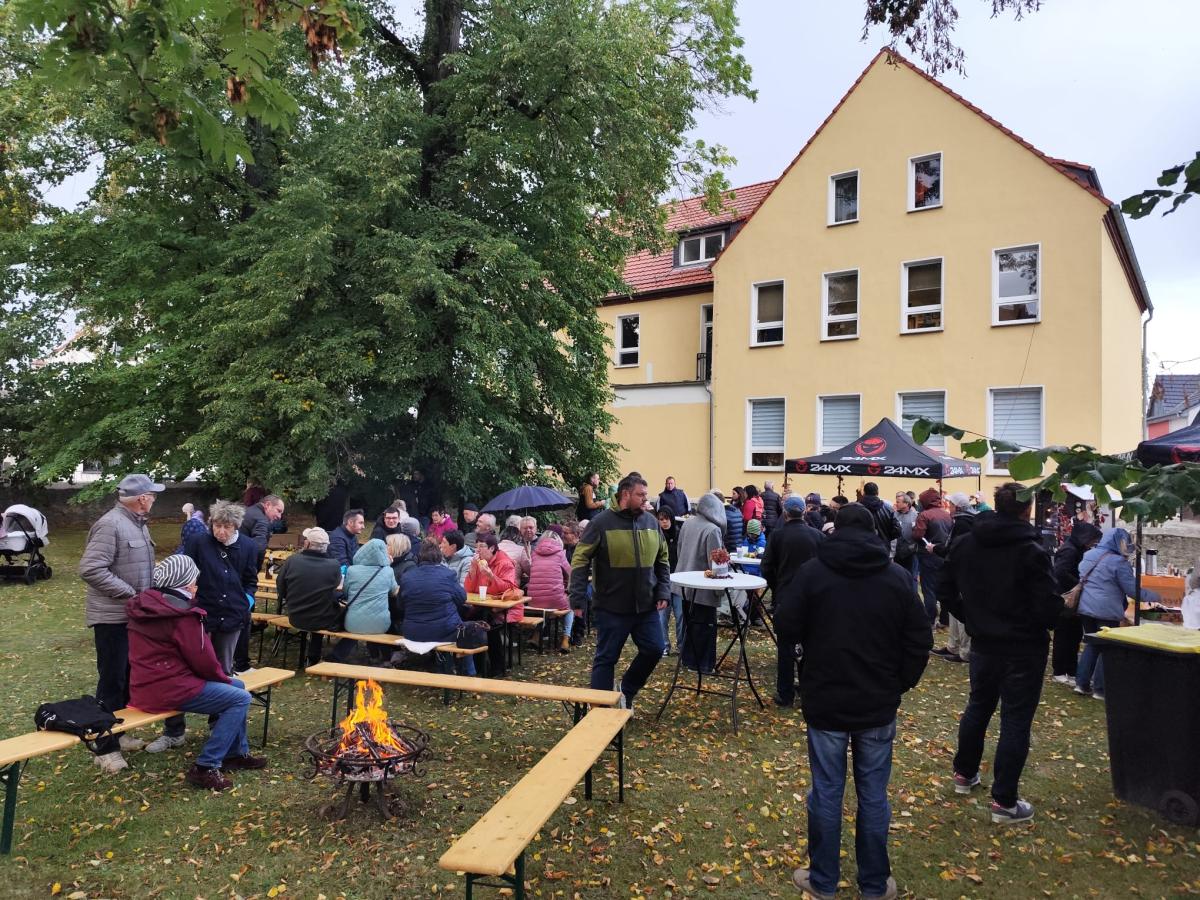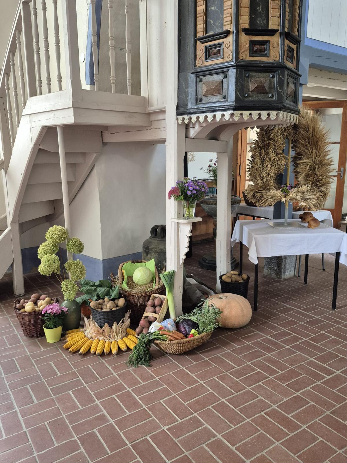 Gemeindepädagogin Almuth Heinze gestaltete den Gottesdienst als lebendige Mitmach-Andacht. Sie lud Kinder und Erwachsene gleichermaßen ein, mitzumachen, zu singen, zu beten und gemeinsam auf das zu schauen, was das Leben reich macht. Besonders die Jüngsten hatten ihre Freude daran, aktiv dabei zu sein – und genau das machte den Gottesdienst so lebendig und herzlich. Ein Höhepunkt war der Auftritt des Kinderchores, der unter der Leitung von Kantor Ronny Hendel drei fröhliche Lieder vortrug. Mit leuchtenden Augen und kräftigen Stimmen sangen die Kinder von Freude, Dank und dem Staunen über die Schöpfung. Ihr Gesang füllte die Kirche mit Wärme und machte vielen im Publikum sichtlich Freude. Nach dem Gottesdienst ging das Feiern draußen weiter. Auf dem Kirchplatz duftete es nach Bratwurst, der Heimatverein Gröden hatte liebevoll Kaffee und Kuchen vorbereitet, und auch Federweißer durfte an diesem Herbsttag nicht fehlen. Wer zwischendurch etwas entdecken wollte, konnte die Heimatstube besuchen und einen Blick in die Geschichte des Ortes werfen. Überall standen kleine Gruppen beieinander, lachten, erzählten, genossen die Sonne und das Beisammensein. Eine Besucherin brachte es auf den Punkt: „Es war einfach schön, mit so vielen Menschen gemeinsam zu feiern.“