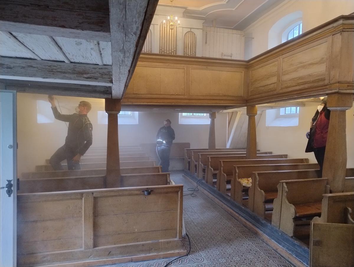 Erste Versuche, das Problem selbst in den Griff zu bekommen, verliefen wenig ermutigend. Doch Aufgeben war keine Option. Gemeinsam mit dem Baureferenten des Kirchenkreises wurde eine Lösung gesucht – und gefunden. Unter fachkundiger Aufsicht entstand ein Plan: Zunächst musste das lose Material sorgfältig entfernt werden, später soll – in Abstimmung mit dem Denkmalschutz – ein neuer Anstrich folgen. Doch bis dahin war viel Handarbeit gefragt. „Wir Frauen im Gemeindekirchenrat haben beraten, wie wir das Projekt angehen. Nach den Arbeiten braucht die Kirche eine gründliche Reinigung – das schaffen wir nicht allein“, erzählt Haupt. Schnell war klar: Es braucht Unterstützung aus dem Dorf. Ein Aufruf wurde geschrieben, der Ortsbeirat angesprochen, und die Resonanz ließ nicht lange auf sich warten. Am vergangenen Samstag trafen sich freiwillige Helferinnen und Helfer aus dem ganzen Ort – aus dem Dorfverein, dem Singekreis, der Nachbarschaft. Sie kamen gut gelaunt, brachten Zeit und Tatkraft mit, und für die Verpflegung war natürlich auch gesorgt. Es wurde gebürstet, gekratzt, gewischt – und viel gelacht. „Es ist schön zu sehen, wie viele mit anpacken, wenn’s drauf ankommt“, sagt Haupt dankbar. „Wir sind froh, in dieser Gemeinschaft zu sein.“