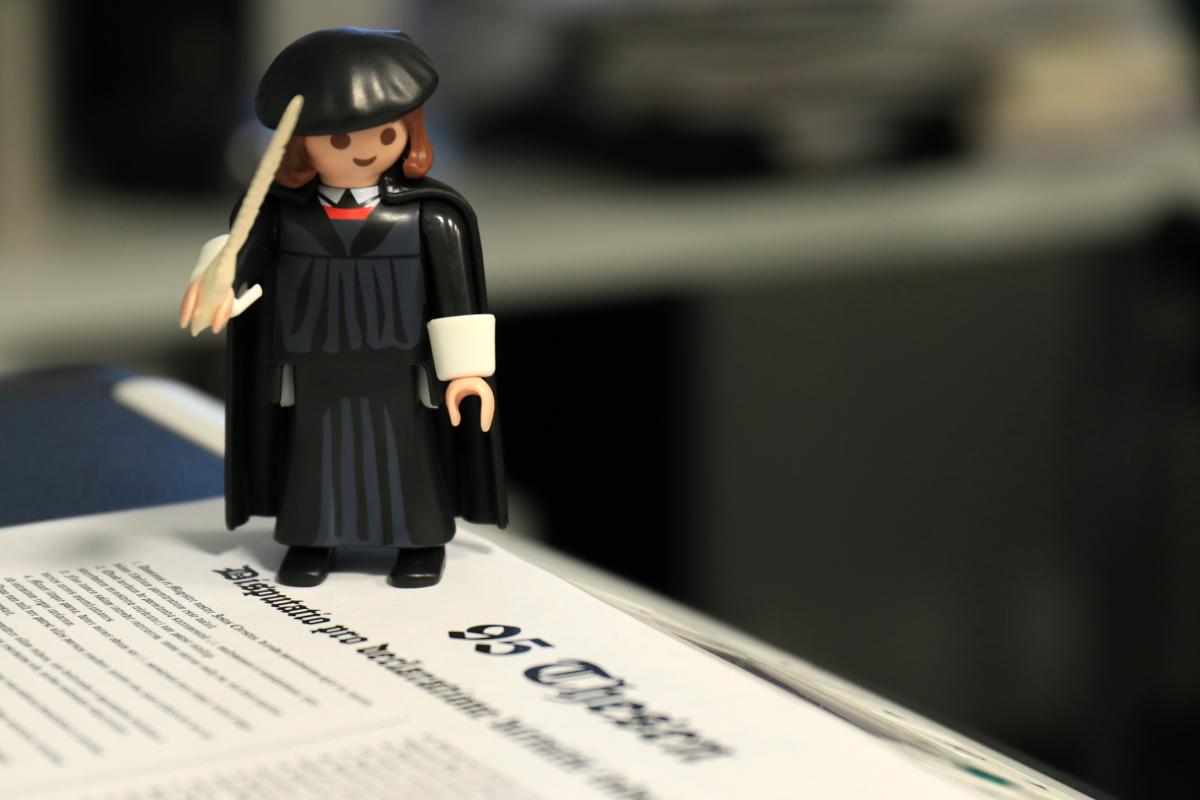 „Mama, hat der einen Zauberstab?“ Mein Kind steht vor dem Bücherregal in meinem Büro und zeigt auf die kleine Figur zwischen Notizheften, alten Gemeindebriefen und einer Lutherbibel: Martin Luther als Playmobilfigur. Schwarzer Talar, runde Mütze, Bibel in der einen Hand, Feder in der anderen. Das Gesicht freundlich, die Augen ein wenig schelmisch.